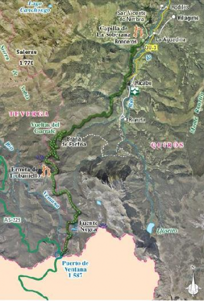 Vuelve de nuevo el camino original por el que se llega a Bueida, y más adelante a Ricabo (680 m.), aldeas en las que se encuentran referencias y restos ligados a edificios asistenciales del camino.