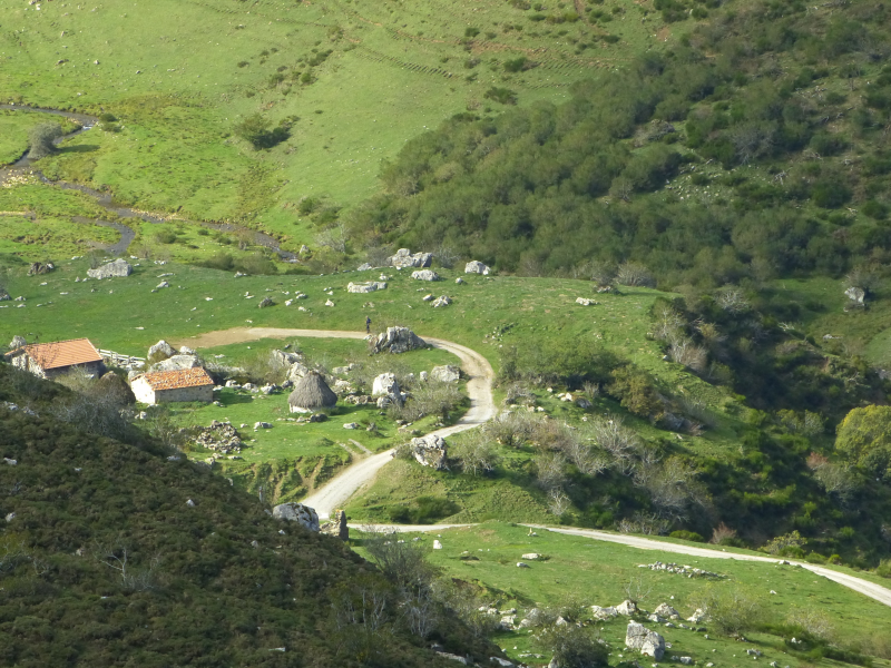 A partir de aquí comenzamos a descender por sendero hacia el valle de Pigüeña, primero por la margen izquierda y más tarde por la derecha, hasta cruzar un puente y enlazar con la pista que conduce a la Braña Los Cuartos o Braña Viecha, que conserva varios teitos muy antiguos.