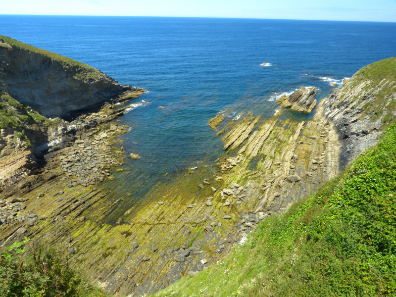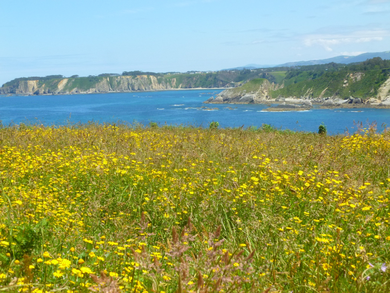 Situados en la parte alta, comenzamos a circular por la GR E-9 (tramo Ortiguera-Viavélez), en dirección oeste, pasando al lado de un mirador sobre los acantilados, en el que aún se conserva un pozo de aguas dulces que antaño abastecía al pueblo.