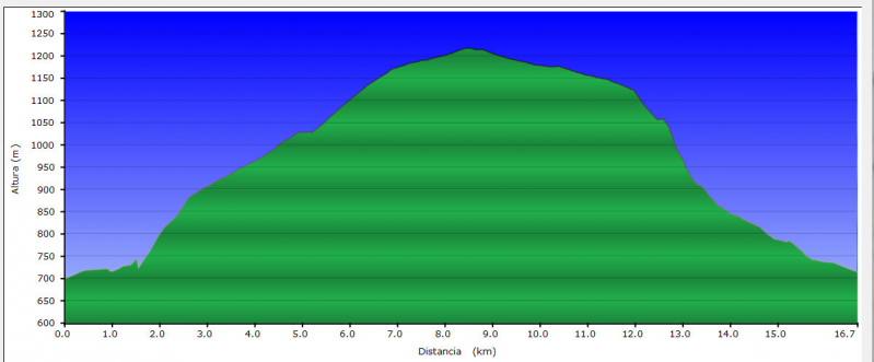 La primera parte de la marcha es en constante subida, hasta el Km. 9 aprox., tramo en el que se salva un desnivel de 520 mts.