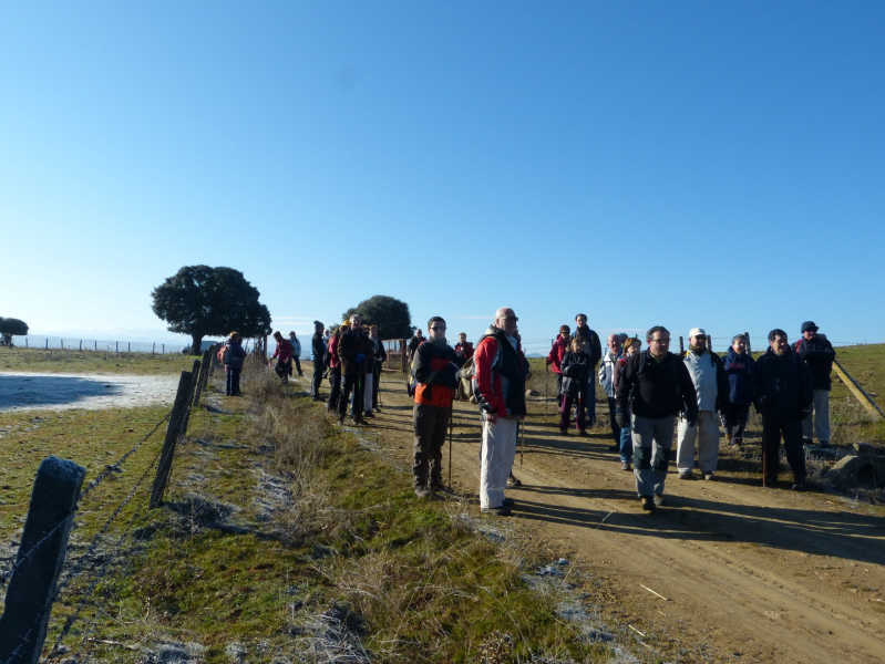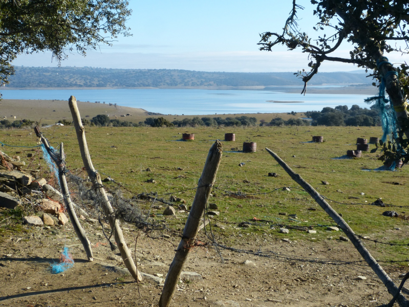 Lo primero que nos encontramos a tan sólo 250 metros, es una enorme indicación azul que nos indica donde se encuentra el club naútico. La dejaremos atrás y seguiremos por el margen de la carretera, para salir de ella tomando la pista que sale a la derecha, a apenas 400 metros. Esta pista delimitada por una alambrada, discurre entre numerosas explotaciones ganaderas que nos acompañarán durante casi todo el camino. El pantano sigue marcando el recorrido a nuestra derecha.
