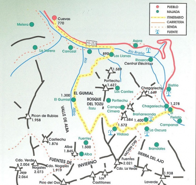 Después, el camino asciende ligeramente tras rebasar su fuente hasta el portillo del bosque del Tozu (bosque de hayas). Se adentra en él bajo el pico Fuentes hasta aproximarnos a la campera de Fuentes de Invierno, que conserva restos de antiguas cabañas.