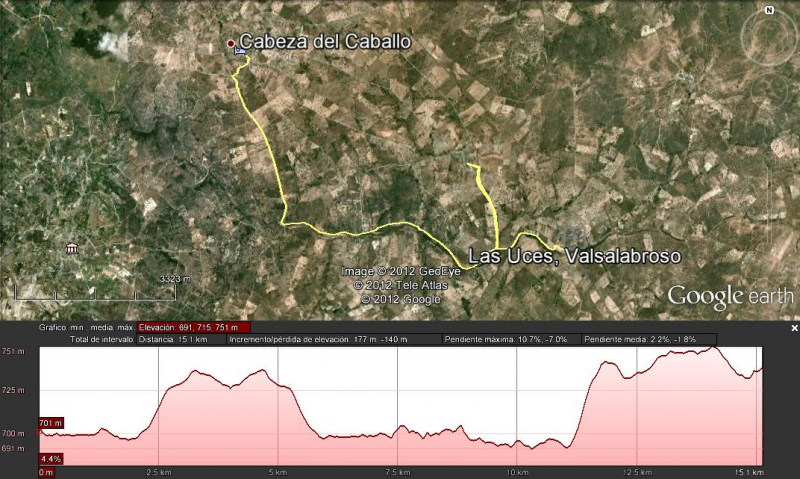 Nosotros seguimos una pista de tierra que sale a mano derecha, en ligero ascenso, llegando a una carretera, girando a través de ésta a la izquierda, para llegar en pocos metros a la localidad de Cabeza del Caballo. Tiempo invertido 4 horas aprox.
